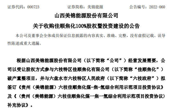 公告稱,公司以受讓股權(quán)方式參與貴州六盤水市六枝特區(qū)佳順焦化有限公司破產(chǎn)重整項目,公司擬提供2.4億元償債資金,獲取佳順焦化剝離掉低效資產(chǎn)后的100%股權(quán)。并與六枝政府?dāng)M簽訂《貴州(美錦能源)六枝佳順焦化煤-焦-氫綜合利用示范項目投資協(xié)議》相關(guān)補(bǔ)充協(xié)議。該項目主要是公司在貴州六盤水市落地投資建設(shè)煤-焦-氫綜合利用示范項目,擬投資金額不超過45億元。