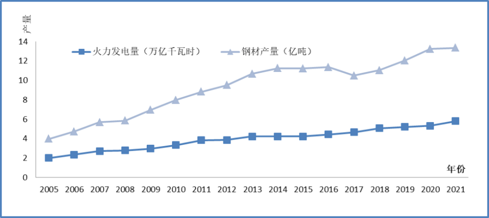 2005~2021 年我國(guó)火力發(fā)電量和鋼材產(chǎn)量示意圖